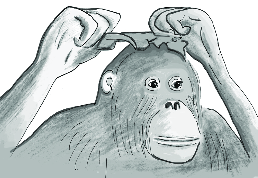 (Suma, an orangutan at a German zoo, often embellished herself in front of a mirror, such as by putting a leaf of lettuce onto her head like a hat while staring at her reflection. Drawing by Frans De waal)